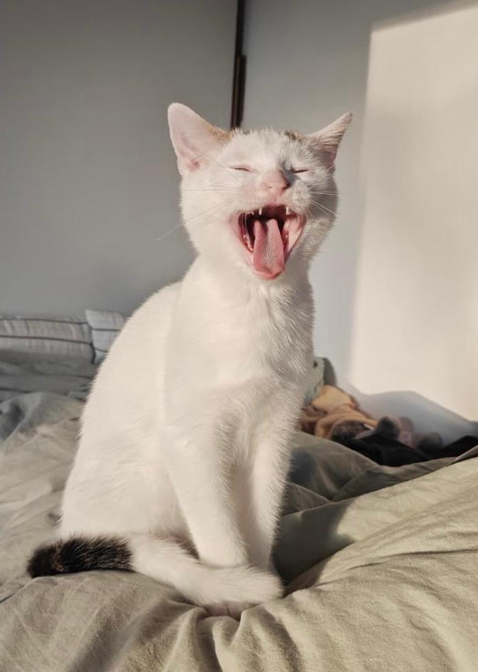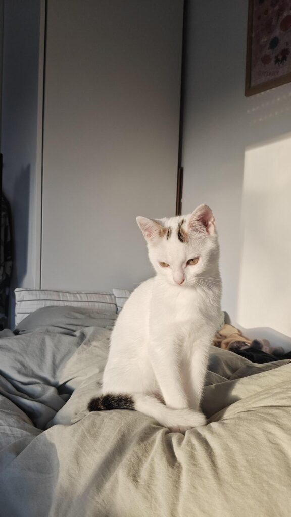 Nina hin­ge­gen ist die neu­gie­ri­ge­re von bei­den. Sie erkun­det mutig neue Umge­bun­gen, auch wenn schnel­le Bewe­gun­gen sie manch­mal erschre­cken. Mit der rich­ti­gen Ruhe und Geduld wird Nina schnell dei­ne Nähe suchen, beson­ders auf dem Sofa oder im Bett, wo sie es liebt, am Hals gekrault zu werden.