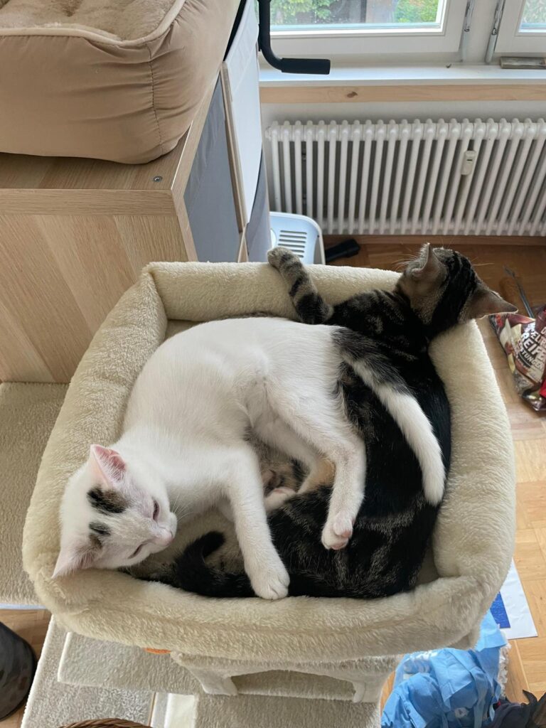 Bei­de Kat­zen ergän­zen sich per­fekt und bie­ten sich gegen­sei­tig Halt. Obwohl sie viel Zeit mit­ein­an­der ver­brin­gen, wis­sen sie sich auch allei­ne gut zu beschäf­ti­gen. Wenn du nach einer lie­be­vol­len Ergän­zung für dein Zuhau­se suchst, die Wär­me und Freu­de bringt, sind Fri­da und Nina genau die rich­ti­gen Beglei­te­rin­nen für dich.